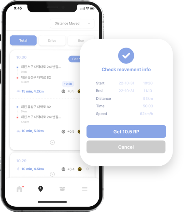 직접 주행을 하지 않아도 교통수단을 이용하여 도로를 달린다는 전제로 모빌리티 데이터를 생성하고 리워드를 획득할 수 있습니다.RUN 모드는 수동시작 BUTTON으로만 시작됩니다.