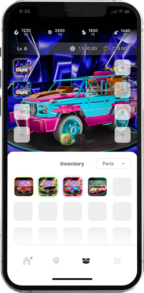 또한 데이터 생성량과 생태계 기여도에 따라 NFT PARTS를 획득할 수 있습니다. 획득한 NFT는 등급에 따라 각각의 능력치와 희귀도를 가지고 있습니다. 사용자는 NFT PARTS를 DIY 방식으로 조립하여 자신만의 NFT를 만들 수 있습니다.
